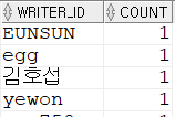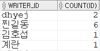 그리고 마지막으로 위의 결과에서 컬럼명에 집계함수가 사용되는 것은 그 결과를 프로그래밍에서 사용할 때는 불편하므로 별칭을 COUNT로 해서 쿼리를 만들면 작성자별로 묶은 집계값 완전하게 만들어진다.