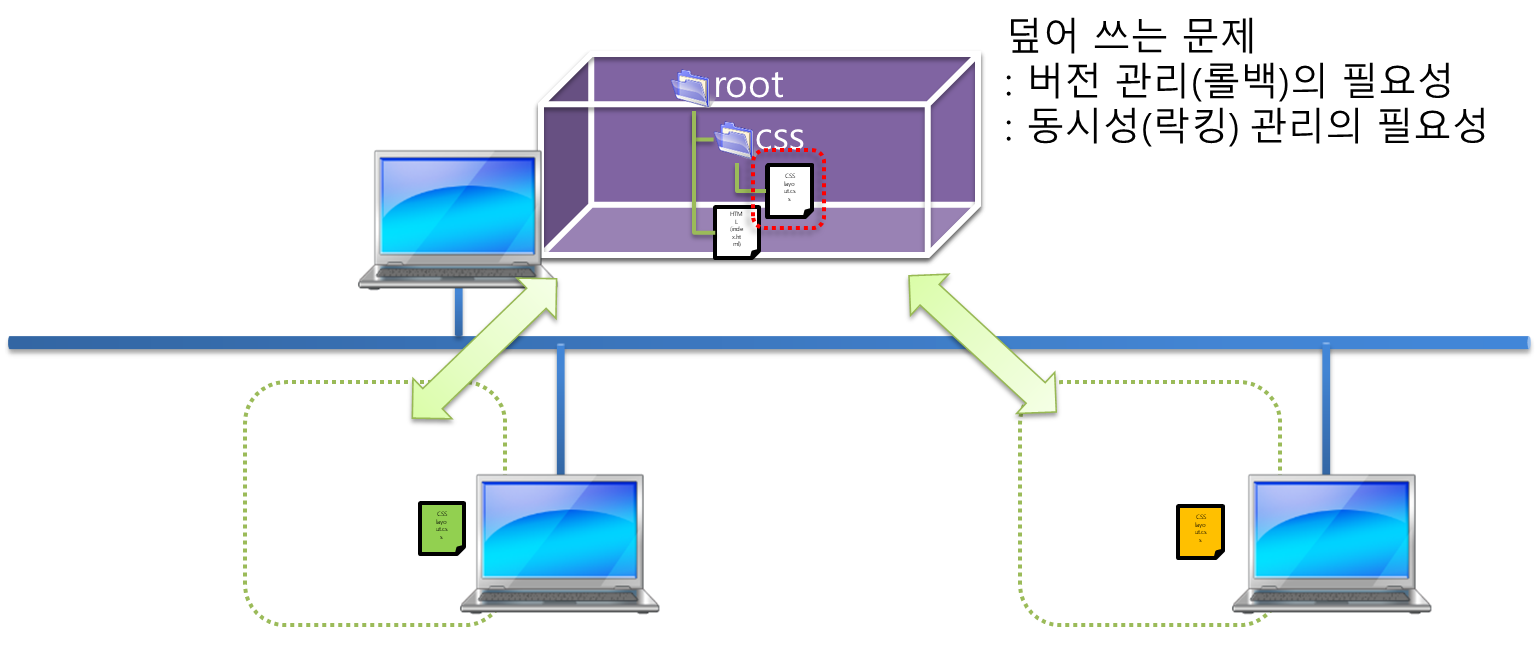 팀원들은 동일한 시간대에 동일한 네트워크에 모인 상태에서 공유할 프로젝트를 서버 컴퓨터에 두고 그것을 팀원들이 함께 손대는 방식이다. 그런데 이런 방식은 편리하기는 하지만 동시성 문제를 발생시킨다.