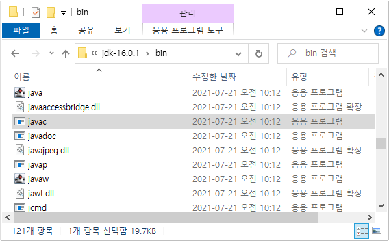 그림에서 선택된 파일 javac.exe가 자바 컴파일러이다. 이 파일은 도스(DOS)와 같은 명령창을 통해서 실행하는 프로그램이다.