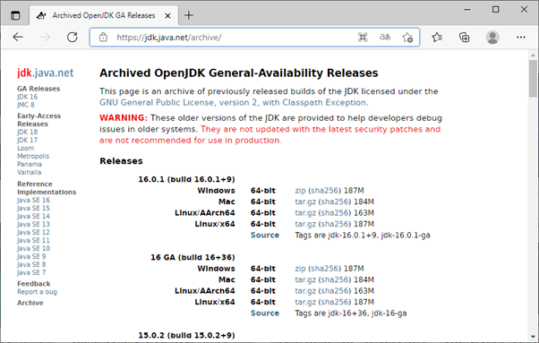 1. 웹 브라우저를 이용해서 openjdk 사이트(https://jdk.java.net/archive/)를 방문한다.