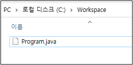필자의 경우는 다음 그림처럼 폴더(Workspace)를 생성하고 그 안에 Program.java 로 저정하였다. 이 때 반드시 파일명의 첫 글자는 대문자로 하고 확장자는 .java로 한다.