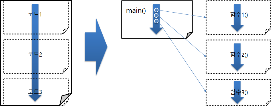 함수 블록은 코드가 길어지면서 그것을 나누어 작성하고자 하는 필요성으로 함수라는 블록을 만들어서 그것으로 코드를 나누는 방법을 사용하게 되었다.