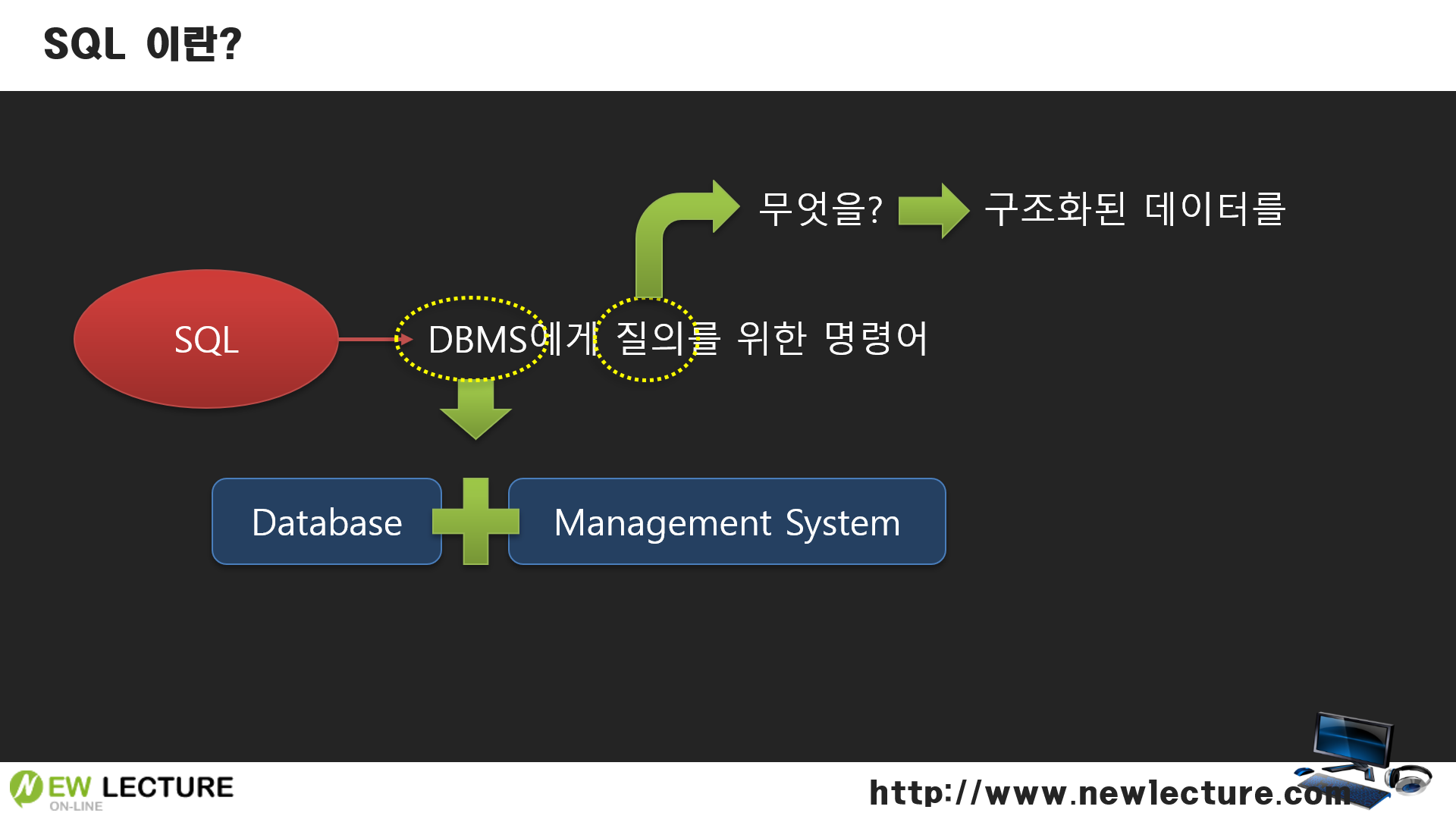 SQL이란 Structured Query Lanuage의 약자로써 DBMS에 질의를 하기 위한 언어(명령어 집합)를 말한다.