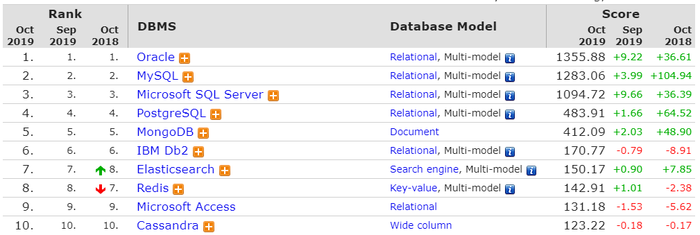 현재 가장 많이 사용되는 DBMS 제품으로는 MS-SQL(by 마이크로소프트), ORACLE(by 오라클), MySQL(by 오라클) 등이 있으며, 그 중에서 2019년 현재 가장 큰 점유율을 보이고 있는 제품은 오라클이다.